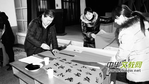1月24日,山東省菏澤市書(shū)法家協(xié)會(huì)主席曹鈺等6位書(shū)法家到定陶縣陳集鎮(zhèn)開(kāi)展文化下鄉(xiāng)活動(dòng),現(xiàn)場(chǎng)為附近群眾書(shū)寫(xiě)春聯(lián),受到群眾歡迎。圖為中國(guó)美術(shù)家協(xié)會(huì)會(huì)員于魯俊為群眾寫(xiě)春聯(lián)。 (本報(bào)記者 苑肇波 攝)