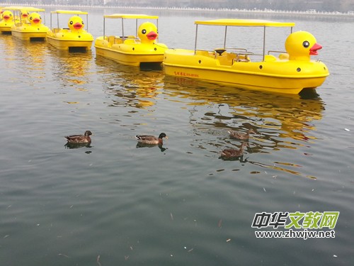 “春江水暖鴨先知”,在春暖乍寒、寬闊的水面上,我們看到多艘“四人黃鴨電動船”飄蕩在靜如春水的什剎海;在波光粼粼的湖面上,它們時(shí)而相互追逐嬉戲、時(shí)而與野鴨相互賽跑……