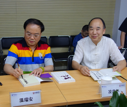 大俠到底是大俠,這種場(chǎng)面已司空見(jiàn)慣,也就見(jiàn)怪不怪,溫瑞安讓助手把簽名筆拿出來(lái),竟大大小小一大把。他說(shuō):請(qǐng)?jiān)彛抑荒芎瀭(gè)姓名。沒(méi)想到溫瑞安已練出了快速簽名的絕技,只見(jiàn)他拿起簽名筆龍飛鳳舞地簽下了自己的大名。蔡浚是去香格里拉酒店接他的,溫大俠也就另眼相待,用大號(hào)的簽名筆多寫了幾句,又換小號(hào)的簽名筆再簽上字小一點(diǎn)的名字,并與蔡浚合影留念。冰凌帶來(lái)了《冰凌幽默小說(shuō)選》送給溫瑞安,溫瑞安回贈(zèng)了自己的新作,并簽好名,再與冰凌合影。溫瑞安讓助理帶了幾本書來(lái),簽名后贈(zèng)送給肖偉、凌文斌、屠軍等幾位。我因特地帶了三本溫瑞安的作品集來(lái),就沒(méi)有拿贈(zèng)書。等在座的都簽好后,我才過(guò)去,先贈(zèng)送了我的微型小說(shuō)集子《那片竹林那棵樹(shù)》,與《凌鼎年與小小說(shuō)》三卷本,事先已簽了名,請(qǐng)溫大俠斧正、指謬,還夾了一張書法作品“俠骨柔情瑞安筆“,書法我是門外漢,字寫得不咋樣,但算表示一份敬意吧。