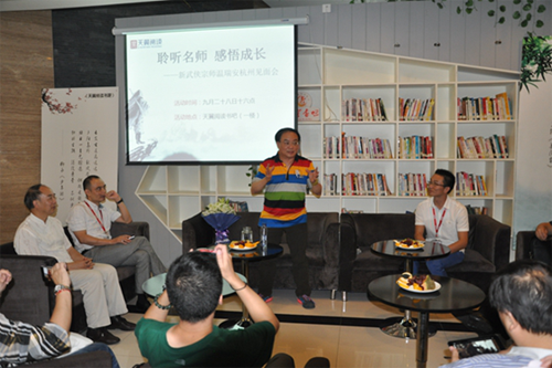 天翼閱讀有個(gè)傳統(tǒng)的活動(dòng),即作家與讀者的見(jiàn)面會(huì),已舉辦過(guò)多場(chǎng),有多位著名作家來(lái)過(guò)。天翼閱讀的員工中有不少書迷,他們也希望與溫大俠零距離接觸一下,就安排了一個(gè)“聆聽(tīng)名師,感悟成長(zhǎng)”主題的讀者見(jiàn)面會(huì),在底樓的天翼書吧,地方不算大,擠得滿滿當(dāng)當(dāng)?shù)模鞒秩藫Q了個(gè)帥哥,他簡(jiǎn)單介紹了溫瑞安后,請(qǐng)溫大俠為在座的后學(xué)說(shuō)幾句,勉勵(lì)、鼓勵(lì)一番。