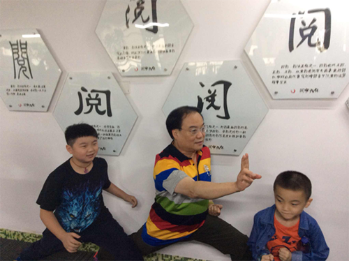 在去會(huì)議室的路上,溫瑞安見(jiàn)有閱讀內(nèi)容的宣傳板,就叫他兩個(gè)兒子來(lái)拍照,兩個(gè)孩子還小,個(gè)子矮,溫先生就扎了個(gè)馬步,做了個(gè)下蹲的武術(shù)動(dòng)作,兩個(gè)孩子也極配合,也各自擺了個(gè)pose。在經(jīng)過(guò)“蘭亭”字樣的地方,溫瑞安又拉他太太一起照個(gè)相,看得出,溫先生對(duì)中國(guó)的傳統(tǒng)文化是十二分敬重的。