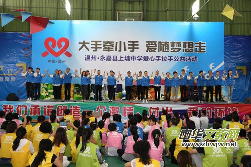 (本報(bào)訊)10月12日,浙江省永嘉縣上塘中學(xué)在永嘉戎城山莊健民籃球館舉行了題為“大手牽小手 愛隨夢想走”的“愛心手拉手”大型公益活動(dòng)。這也是杭州大業(yè)堂LP17“愛心手拉手”活動(dòng)第一次走進(jìn)永嘉。參加活動(dòng)的有上塘中學(xué)的學(xué)生、老師及其家長,還有LP17團(tuán)隊(duì)全體成員及來自全國各地的義工們共300多人。