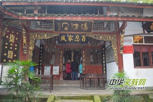 在長(zhǎng)寧縣清河園川南民居館——張玉龍的家里,整個(gè)院落古樸典雅,掛滿了各種牌匾,也是該縣重要的群眾文化活動(dòng)基地,其中有:宜賓市文聯(lián)創(chuàng)作基地,長(zhǎng)寧縣政協(xié)文史委員活動(dòng)基地等。據(jù)介紹,“清河園”占地約3畝,建筑面積5000多平方米,為全楔式木結(jié)構(gòu)的川南民居風(fēng)格,配以三合院的布局,因地制宜、隨勢(shì)而筑,以木制梁、楔、柱、椽,以竹隔墻夾樓,以磚、石砌墻,以瓦蓋頂,后院天井、涼亭、回廊相映成趣,空間豐富多變,層次錯(cuò)落有致,造型空透輕盈、色彩清明素雅,與大自然融為一體,宛似天成,其抗震防水災(zāi)性好。由于其一磚一木皆是地道的老式舊料,所以整個(gè)風(fēng)格古色古香,展現(xiàn)了川南民居的風(fēng)格特點(diǎn)。