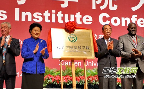 12月7日,第九屆全球孔子學(xué)院大會(huì)開幕式在福建廈門舉行,國(guó)務(wù)院副總理、孔子學(xué)院總部理事會(huì)主席劉延?xùn)|出席開幕式。這是劉延?xùn)|為孔子學(xué)院院長(zhǎng)學(xué)院揭牌。