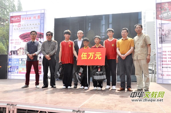江蘇邳州市新河文武自強(qiáng)學(xué)校的學(xué)生現(xiàn)場表演了精彩的武術(shù)節(jié)目,到場書畫家現(xiàn)場揮毫?xí)鴮懀鬓k方現(xiàn)場抽獎拍賣,將所得善款五萬元捐贈給了到場的五位貧困中小學(xué)生。