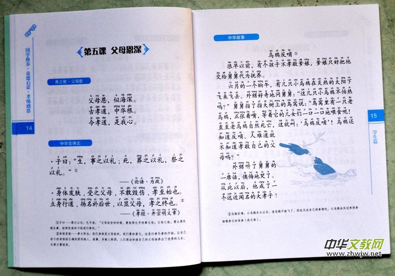 《國學(xué)修養(yǎng)·童德啟蒙》(小學(xué)版)按年級共分為六冊,內(nèi)容分別為《孝悌感恩》、《師生友愛》、《習(xí)慣養(yǎng)成》、《勤奮學(xué)習(xí)》、《熱愛祖國》、《童心養(yǎng)正》,每冊課本均圖文并茂,其中第一冊至第三冊還加了注音,第一冊至第五冊的每一課均新編了“養(yǎng)正歌”,朗朗上口,極容易背誦和理解,如:第一冊第二課《父母恩情》“養(yǎng)正歌·父母歌”:“水有源,樹有根。我父母,給我身。養(yǎng)育我,操碎心。”全書精心設(shè)置了中華古詩文和中華故事及傳統(tǒng)文化小課堂和想想做做等內(nèi)容。