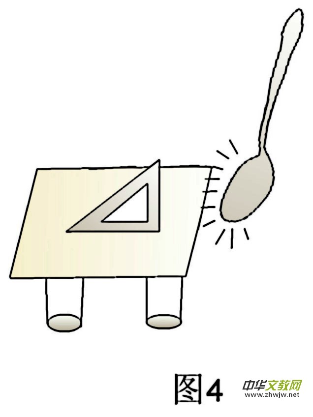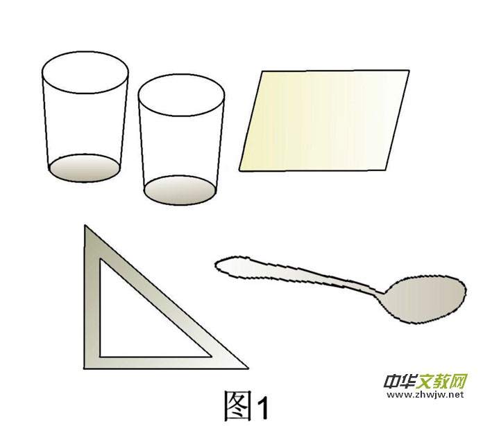 材料:玻璃杯兩只,金屬板一塊(可用易拉罐剪去上、下底,再從中間順著剪開即是一塊金屬板),塑料三角尺一塊,鋁制湯匙一只,舊毛織布料一塊(如圖1)。