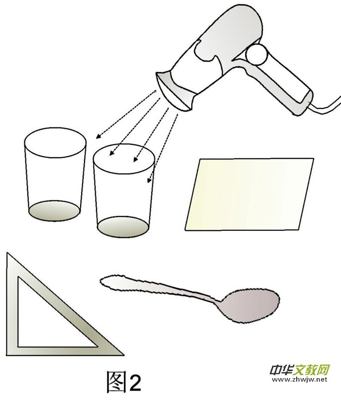 1.把玻璃杯、金屬板、小湯匙及塑料尺和布料用吹風機吹干(如圖2);