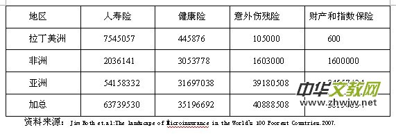 當(dāng)前,小額保險(xiǎn)在世界各個(gè)地區(qū)從無到有、蓬勃發(fā)展、規(guī)模不斷壯大。小額保險(xiǎn)中心(The microinsurance Centre, LLC)在亞洲、非洲、美洲三個(gè)區(qū)域針對(duì)小額保險(xiǎn)的研究表明,在被調(diào)研的100個(gè)國(guó)家內(nèi),有77個(gè)國(guó)家正在促進(jìn)小額保險(xiǎn)業(yè)務(wù)(不包括社會(huì)保障制度),就小額保險(xiǎn)的供給主體數(shù)量來講,亞洲地區(qū)的印度,非洲地區(qū)的馬里等國(guó)的機(jī)構(gòu)數(shù)量較多,均為21-50家[1](2007年數(shù)據(jù))。在世界主要小額保險(xiǎn)產(chǎn)品中,研究表明在四大類險(xiǎn)種中,人壽險(xiǎn)的發(fā)展規(guī)模最大,其后依次是意外傷殘險(xiǎn)、財(cái)產(chǎn)和直屬保險(xiǎn),健康險(xiǎn)的發(fā)展規(guī)模最小,按照地區(qū)分類,亞洲的小額保險(xiǎn)市場(chǎng)發(fā)展規(guī)模最大,但同樣也面臨著健康險(xiǎn)發(fā)展不足的問題。這也許跟健康險(xiǎn)本身的特點(diǎn)相關(guān),但同時(shí)也給小額保險(xiǎn)未來的發(fā)展方向指明了道路。