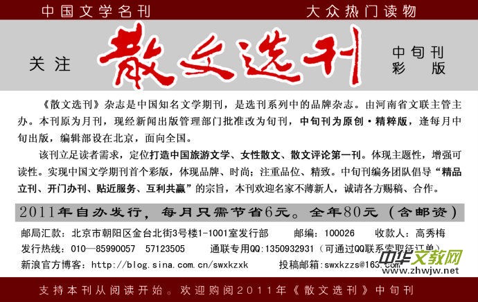 請大家關(guān)注信息發(fā)布:散文選刊中旬刊官方博客:http://blog.sina.com.cn/swxkzxk