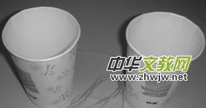 1.取兩個完好的紙杯,再取一根適當長度的棉線,一把小刀。