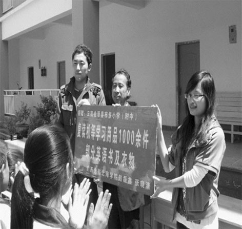 趙磊鑫、張曉清說在西部愛心網(wǎng)上看到了會(huì)澤布多小學(xué)(附中)的求助帖子,自己從生活費(fèi)擠出錢來為孩子們購買了禮物。從廣西北航到南寧,再從南寧坐火車到曲靖,后從曲靖到會(huì)澤,長途跋涉,來到布多小學(xué)奉獻(xiàn)一片愛心。趙磊鑫說:回到學(xué)校后,把這里的情況向同學(xué)們宣傳,有可能會(huì)募捐到更多的愛心禮物。
