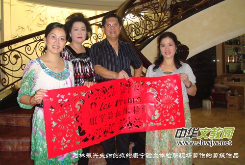 美的藝術(shù)人人喜愛(ài),美的圖案讓人心馳神往。高少萍、張崢嶸熱心向印尼民眾傳授剪紙藝術(shù),傳播友誼。不少人請(qǐng)求她們?yōu)樽约杭艏垼乙蟀褑挝坏拿Q、標(biāo)志也鑲嵌進(jìn)剪紙中。她們愉快地接受這些命題創(chuàng)作,常常挑燈夜戰(zhàn),加班加點(diǎn)地完成,深受對(duì)方的喜愛(ài)。在印尼的餐館內(nèi),她們邂逅馬來(lái)西來(lái)華人覃永建一家,夫妻非常喜歡中國(guó)古老的民間剪紙藝術(shù),懇求送一幅剪紙,并把自己的“世金企業(yè)有限公司”標(biāo)志剪進(jìn)去。兩位高手不負(fù)期望,當(dāng)場(chǎng)剪成,一家人如獲至寶,再三感謝。
