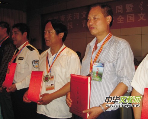 2013年5月18日上午楊維永(右一)在主席臺領(lǐng)取《作家報》頒發(fā)的《楊維永短篇小說集2》青天河杯金獎。