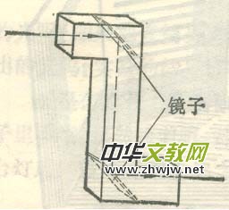 (3)、把剪好的包裝套折成Z字形,用透明膠布把交接處粘牢,在兩個(gè)直角的外面與內(nèi)角面延長(zhǎng)處各切一條直縫,直縫插進(jìn)長(zhǎng)方形玻璃鏡(兩端留外),用透明膠布固定好。這樣潛望鏡就做成了。(如圖2)