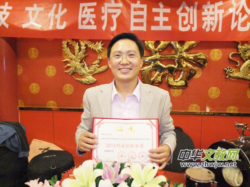北京福禱平安酒業(yè)有限公司開發(fā)的大度尊酒榮獲科技創(chuàng)新金獎(jiǎng),圖為該公司總經(jīng)理趙友秀在領(lǐng)獎(jiǎng)臺(tái)上