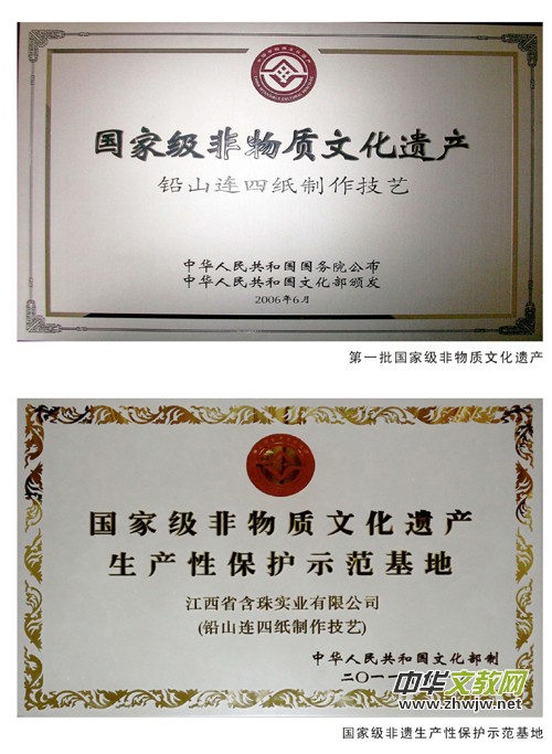 2009年,江西含珠實(shí)業(yè)有限公司即已完全恢復(fù)其古法72道工藝,制作的紙品質(zhì)量得到杭州西泠印社、中國(guó)國(guó)家圖書(shū)館等國(guó)家重點(diǎn)文博單位認(rèn)可,并被列為杭州西泠印社連四紙定點(diǎn)生產(chǎn)基地和國(guó)圖用紙生產(chǎn)單位。2010年以來(lái),江西含珠實(shí)業(yè)有限公司應(yīng)邀在上海世博會(huì)、首屆、二屆中國(guó)非遺博覽會(huì)、國(guó)際生態(tài)文化節(jié)、成都國(guó)際非遺節(jié)等文博會(huì)節(jié)進(jìn)行連四紙制作技藝展演,使更多的人了解連四紙制作技藝。2011年,含珠實(shí)業(yè)連四紙制作技藝傳習(xí)所經(jīng)國(guó)家文化部專家評(píng)審小組審定,已列入國(guó)家級(jí)非物質(zhì)文化遺產(chǎn)生產(chǎn)性保護(hù)示范基地。該企業(yè)還被評(píng)為全國(guó)生態(tài)文化示范企業(yè)。 2011年11月,江西含珠實(shí)業(yè)有限公司被文化部命名為“第一批國(guó)家級(jí)非物質(zhì)文化遺產(chǎn)生產(chǎn)性保護(hù)示范基地”、“江西省文化產(chǎn)業(yè)示范基地”。