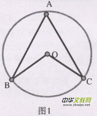 3、在學(xué)習(xí)圓周角定理第一節(jié)課中圓周角定理的三種情況分類證明是個(gè)難點(diǎn)我制作了如右圖1的教具,用了一個(gè)皮筋代表AB和AC,點(diǎn)B,C固定皮筋兩端,點(diǎn)A繞著圓周移動(dòng)這樣就很直觀的把圓周角與圓心三種位置關(guān)系即圓心在圓周角的外部,內(nèi)部,一條邊上展現(xiàn)給學(xué)生,難點(diǎn)得以突破。