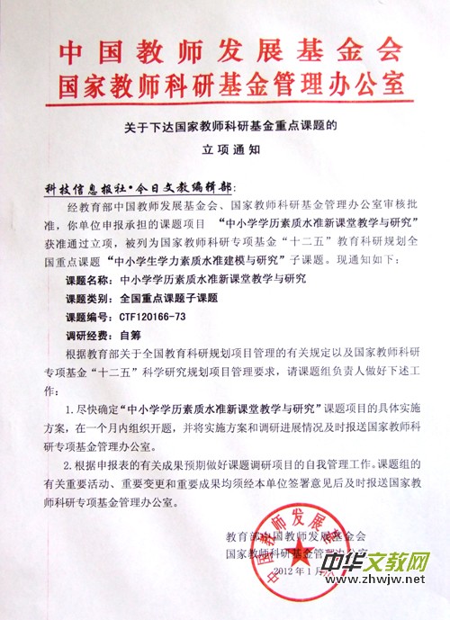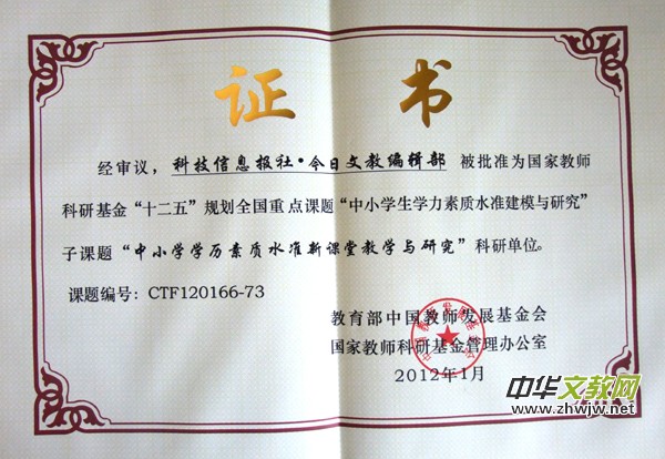 本報訊 2012年1月15日,本報拿到了由教育部中國教師發(fā)展基金會國家教師科研基金管理辦公室批準的國家教師科研基金"十二五"規(guī)劃全國重點子課題"中小學學力素質(zhì)水準新課堂教學與研究"科研單位 立項證書和文件批復。