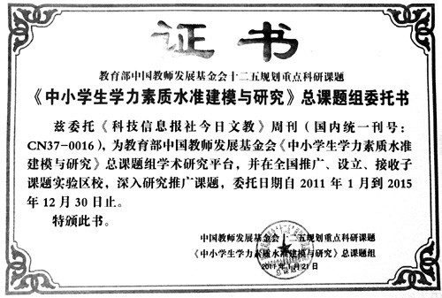 經(jīng)教育部中國教師發(fā)展基金會、國家教師科研專項基金管理辦公室批準,《科技信息報·今日文教》編輯部被指定為國家教師科研“十二五”規(guī)劃重點課題《中小學生學力素質(zhì)水準建模與研究》總課題和子課題《中小學學力素質(zhì)水準新課堂教學與研究》的組織研究者和課題科研單位,并被總課題組授權(quán)為其總課題組學術(shù)研究平臺,本報主編靳新國和編輯部主任王紅研為總課題專家組成員、主編靳新國并被任命為工作組組長。經(jīng)決定,二零一三年主要工作以發(fā)展國家教師科研專項基金十二五”規(guī)劃重點課題《中小學生學力素質(zhì)水準建模與研究》子課題、實驗區(qū)校,和編輯部承擔的子課題《中小學學力素質(zhì)水準新課堂教學與研究》實驗聯(lián)合校、研究員為首要工作,同時開展“全國優(yōu)秀校長、班主任、教師”的推薦評選、和“全國優(yōu)秀教師論文”、“全國教師教育科研錄像優(yōu)質(zhì)課、課件、教案評選”活動等。具體申報《中小學學力素質(zhì)水準新課堂教學與研究》實驗聯(lián)合校、或研究員條件及要求、服務(wù)如下: