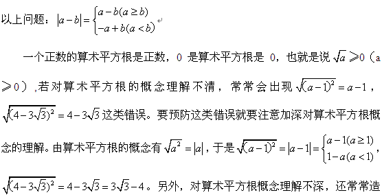 數(shù)學(xué)概念是抽象化的空間形式和數(shù)量關(guān)系,是反映數(shù)學(xué)對象本質(zhì)屬性的思維形式。概念都有內(nèi)涵和外延,即其涵義和適應(yīng)范圍,是判斷、推理的基礎(chǔ),是構(gòu)成思維的基本單位,就數(shù)學(xué)來說,概念尤其占據(jù)著突出重要的地位,有時,它是邏輯地導(dǎo)出有關(guān)定理和法則的出發(fā)點(例如,從“對頂角”的概念,立即可導(dǎo)出“對頂角相等”的結(jié)論);有時,它又是前一知識階段發(fā)展到后一知識階段的轉(zhuǎn)折點(例如,“平方根”概念的引入為突破有理數(shù)的局限開辟了一條道路)。因此,在數(shù)學(xué)學(xué)習(xí)過程中,深刻理解概念應(yīng)放在首要的位置。由于對基本概念的理解不透徹,在解題時常常會出現(xiàn)錯誤。例如: