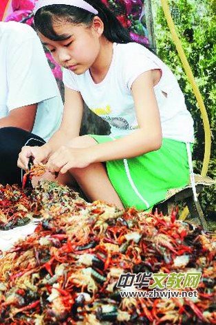 面對張牙舞爪的龍蝦,你會害怕嗎?想必大多數(shù)孩子對那兩把大鉗子都會望而生畏,13歲的張小妮卻敢于“直面”這些兇猛的家伙。張小妮是婺城區(qū)民工子弟學(xué)校五年級的學(xué)生,她的暑假里總是有很多的“活”要干。今年一放暑假,她就找到了一份剝龍蝦的活,每天上午8時到11時,便是她的“工作時間”。
