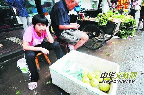 這個小女孩名叫姜晨蕾,今年13歲,是婺城區(qū)蔣堂鎮(zhèn)澤口小學(xué)的學(xué)生。她還有一個妹妹,今年7歲,在市區(qū)丹溪小學(xué)上大班,箱子里的書包是妹妹的。姜晨蕾剛剛把妹妹接回家,然后就趕到菜場來賣香瓜了。和記者聊天的時候,小女孩臉上的那抹憂郁慢慢褪去了一些。
