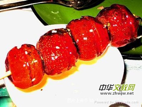 今天中午放學(xué)的時(shí)候,媽媽給我買了一串糖葫蘆。糖葫蘆是由山楂、大米還有糖稀組成的。紅紅的山楂張開大嘴含著白白的大米,水晶般的糖稀包在外面,上面還零星的撒著幾粒芝麻,看著就想吃。雖然天氣很冷,一張開小嘴就會(huì)進(jìn)冷風(fēng),但我還是迫不及待地吃了一口。呀!甜甜的酸酸的,糖稀脆脆的,味道好吃極了!我又給媽媽吃了一口,媽媽也說很好吃。不一會(huì)兒這根糖葫蘆就被我們吃光了。