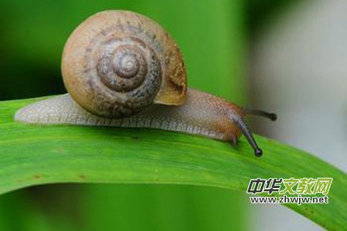 蝸牛有一個(gè)很硬的殼,這個(gè)殼就是它溫暖家 。蝸牛也有頭、有腹、有尾 ,它頭上有兩對(duì)觸角,一對(duì)長(zhǎng),一對(duì)短。長(zhǎng)觸角的頂端長(zhǎng)著一雙很小很小的眼睛,短觸角的下面有一張小嘴巴。聽科學(xué)老師說,蝸牛是世界上牙齒最多的動(dòng)物,它的嘴里長(zhǎng)著上萬顆牙齒,我們的肉眼是看不見的。