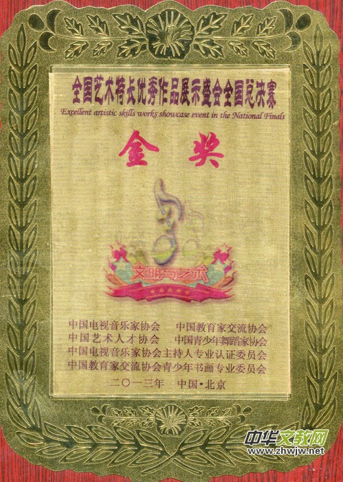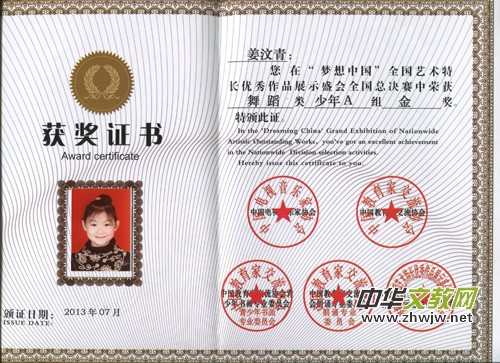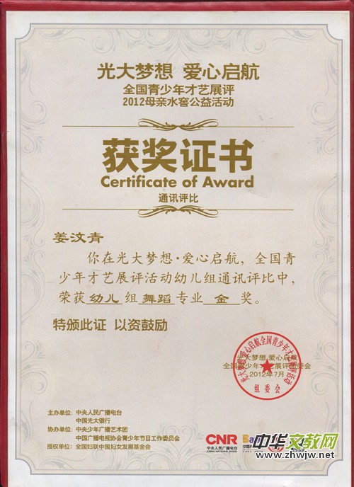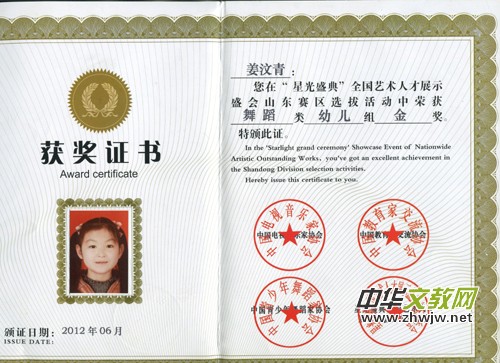 功夫不負(fù)有心人。經(jīng)過一年來的專業(yè)培訓(xùn),姜汶青的藝術(shù)學(xué)業(yè)取得了很大的成績(jī),藝術(shù)水平達(dá)到了與同代人相比的爐火純青境界。姜汶青于2012年6月參加中國電視音樂家協(xié)會(huì)、中國教育家交流協(xié)會(huì)、中國青少年舞蹈家協(xié)會(huì)、星光盛典全國藝術(shù)人才展示盛會(huì)、山東組委會(huì)聯(lián)合舉辦的“星光盛典”全國藝術(shù)人才展示盛會(huì)山東賽區(qū)選拔活動(dòng)中榮獲舞蹈幼兒組金獎(jiǎng);于2012年7月赴京參加由中央人民廣播電臺(tái),中國光大銀行、中國廣播電視協(xié)會(huì)青少年節(jié)目工作委員會(huì),全國婦聯(lián)發(fā)展基金會(huì)聯(lián)合主辦的“光大夢(mèng)想,愛心啟航”全國青少年才藝展評(píng)活動(dòng)幼兒組通訊評(píng)比中榮獲幼兒組舞蹈專業(yè)金獎(jiǎng);于2013年5月在濟(jì)南參加由中國電視音樂家協(xié)會(huì),中國青少年舞蹈家協(xié)會(huì),“舞動(dòng)世界”全國藝術(shù)新星舞蹈大賽山東組委會(huì)聯(lián)合主辦的“舞動(dòng)世界”全國藝術(shù)新星舞蹈大賽山東賽區(qū)選拔活動(dòng)中榮獲民舞類兒童組“特金獎(jiǎng)”;2013年7月赴京參加中國電視音樂家協(xié)會(huì)、中國教育家交流協(xié)會(huì)、中國教育家青少年書畫專業(yè)委員會(huì)、中國教育家交流協(xié)會(huì)朗誦專業(yè)委員會(huì)、夢(mèng)想舞臺(tái)全國藝術(shù)優(yōu)秀作品展示盛會(huì)、全國委員會(huì)聯(lián)合主辦的“夢(mèng)想中國”全國藝術(shù)特長作品展示會(huì)、全國總決賽中榮獲舞蹈類少年A組金獎(jiǎng)。