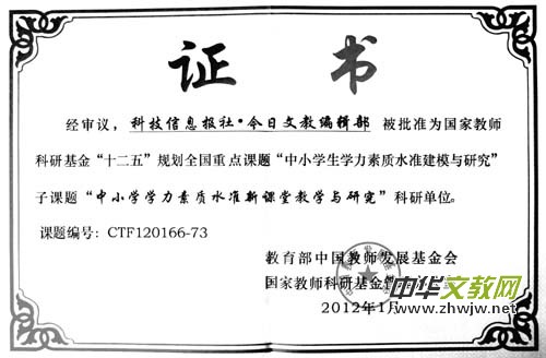 三、實驗聯(lián)合校與編輯部共同開展《中小學學力素質水準新課堂教學與研究》的課題研究,頒發(fā)給學校銅牌和證書,聘請校長擔任課題實驗校課題組長,學校選出5-10名教師擔任課題研究員,頒發(fā)證書;成績突出的將推薦參加國家教師科研辦、中國教師發(fā)展基金會舉辦的“十二五”教育科研先進集體和先進個人及“全國優(yōu)秀科研校長、教師”的評選。