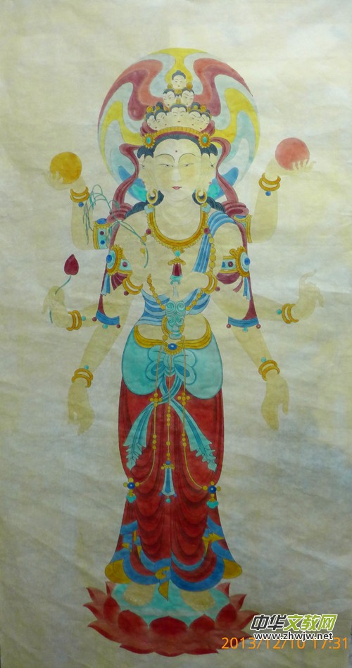 清泉為人低調(diào),平日以靜修佛法,恭繪佛像為主,佛教繪畫是靠畫家們對宗教的理解和認識形象實現(xiàn)在繪畫中,也是宗教利用畫家的生活、感情、技巧和匠心把宗教精神凝結和體現(xiàn)在畫中的,林清泉臨摹的敦煌壁畫屬于勾染法中大著色的工筆重彩,以石色渲染為主,薄色重疊,最后開臉。這種畫法,使畫面充實,靈動,感染力強。色調(diào)多用白、綠、土紅、赭石、青、黑等礦物色,現(xiàn)代人將這色調(diào)稱之為“敦煌色調(diào)”。用這些色調(diào)和成間色、間色之間再次配比、協(xié)調(diào),不管恢弘巨構還是婉轉深情的小品,都表達的淋漓盡致。