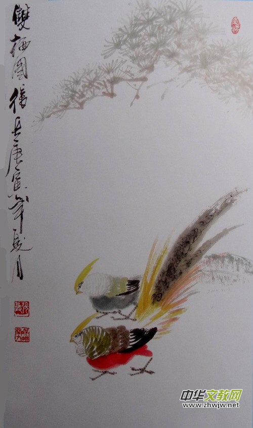 由于宣傳的需要,記者有幸走進他的創(chuàng)作室,立刻被眼前的景象所吸引,只見他寬敞整潔的室內(nèi)掛滿了各式各樣的書法與繪畫作品。在他創(chuàng)作的字畫中,最吸引眼球的要數(shù)那些“花、鳥、魚、蟲,蝦、蟹、雞、蛙”了 。他筆下的花鳥魚蟲、梅蘭竹菊個個生靈活現(xiàn),幅幅色彩斑瀾,極為傳神……。仔細品味其中的意韻,可以感悟到他那傳統(tǒng)深厚的功力和清心寧靜的內(nèi)心獨白,其作品在舒緩的節(jié)奏中慢慢釋放出一種發(fā)自內(nèi)心深處的芬芳。特別是他筆下的書法遒勁厚重、流暢瀟灑更能突顯軍人的特質(zhì)。如“軍魂”、“藝海”、“長樂”、“天道酬勤”、“觀海聽濤”、“ 劍膽琴心”等書作,看似風(fēng)清云雅,漫不經(jīng)意;細品則剛?cè)岵ㄏ銚浔牵嵨稛o窮;不僅體現(xiàn)他高風(fēng)亮節(jié)、一身正氣、熱愛軍營生活的個性風(fēng)格,而且也體現(xiàn)了他勤奮好學(xué)、多才多藝,文蹈武略的現(xiàn)代軍人崇高精神境界。
