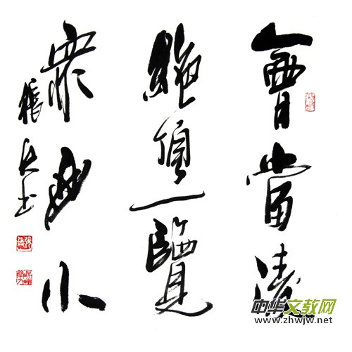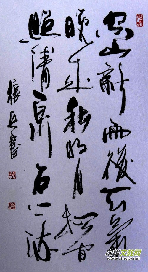 綜觀張兵先生的書畫作品,在清秀雅致中飽含大氣豪情。張兵先生的行書融漢隸、魏碑、唐楷于一爐,時見篆書及章草于筆意。用筆方圓兼?zhèn)洌芈痘ヒ姡Y(jié)體率真,以險求隱,拙中寓巧,平中見奇,矯健厚重中蘊藉著書卷氣息和俊逸灑脫的神韻。結(jié)字嚴(yán)謹(jǐn),自然生動。每一筆畫,筆筆到位,點點傳神,點畫搭配十分巧妙,清新怡人。其主要的筆畫結(jié)字,自然流暢,有法無規(guī),變化多端,涵納墨韻。書寫起來龍飛鳳舞,行云流水連綿不斷。整體適當(dāng),字里行間,合于法度。瀟灑縱橫,視而不拘,此乃書法之美哉。他的作品猶為有情趣,有詩意的散文,使人產(chǎn)生一種親切感和溫馨感,那種幽靜、自然、和諧的畫境無疑能給人們的心靈世界以撫慰。