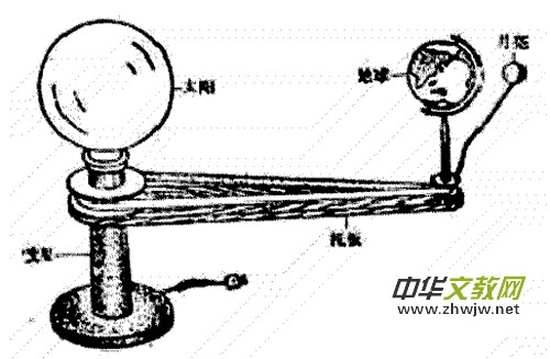 5.托板;在大皮帶輪下面的軸上裝一塊可以繞軸轉(zhuǎn)動的托板,托板長約50-60厘米。它的右端有一個孔,將小皮帶輪的軸固定在孔內(nèi),掛上松緊合適的皮帶,推動托板,使托板帶動地球繞太陽轉(zhuǎn)動,同時小皮帶輪驅(qū)動月亮繞地球旋轉(zhuǎn)。