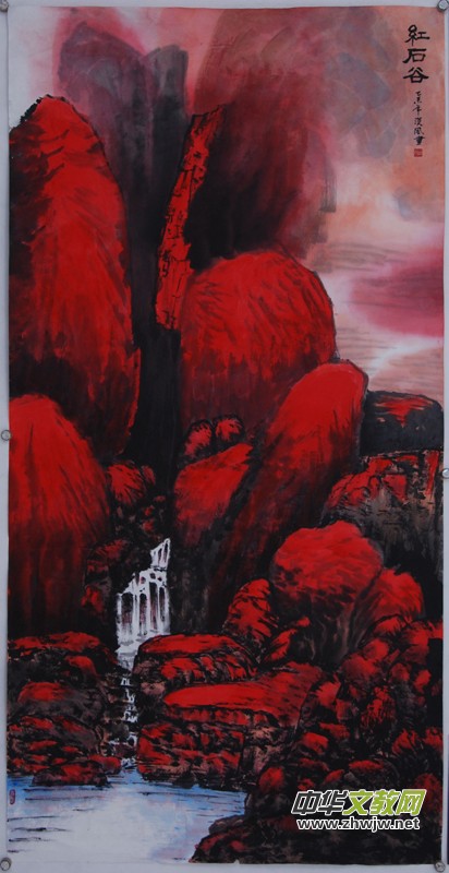 漠風(fēng)的出奇之處在于最近創(chuàng)作的紅色山水寫意畫,她以粗獷、豪邁的筆墨語(yǔ)言,濃重深厚色彩畫出了紅色中國(guó)之山河的壯美。許多同行畫家看著這個(gè)柔弱的小女子在宋莊一個(gè)畫室內(nèi)創(chuàng)作出如此澎湃大氣的作品《萬(wàn)里山河別樣紅》、《紅石谷》,覺得難以想象。