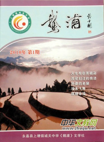 永嘉縣城關(guān)中學(xué)《鵝浦》文學(xué)社創(chuàng)辦于1995年,至今已有十幾年的歷史。《鵝浦》文學(xué)社自創(chuàng)辦以來,受到學(xué)校領(lǐng)導(dǎo)的悉心關(guān)懷和上級領(lǐng)導(dǎo)的大力支持,著名教育家、語文特級教師錢夢龍先生為本刊題寫刊名“鵝浦”兩字。在這十多年的歷程中,從最初的油墨印刷到現(xiàn)在的精美排版;從簡單的欄目到內(nèi)容的豐富多彩;從最初的幾百份校內(nèi)傳閱到現(xiàn)在的全校師生人手一冊。鵝浦文學(xué)社不斷壯大,社刊《鵝浦》正日趨成熟。多年來,鵝浦文學(xué)社通過不斷努力,取得了一系列的可喜成績。據(jù)統(tǒng)計,共有30多人次在省級以上比賽中獲獎或在省級刊物上發(fā)表文章,80多人次在溫州市各類征文中獲獎,90多人在溫州都市報等刊物上發(fā)表文章,縣級作文比賽獲獎人數(shù)位居全縣前茅。近年來還特邀永嘉縣教育局谷福林老師為名譽(yù)顧問,具體指導(dǎo)《鵝浦》編審工作,《鵝浦》的質(zhì)量得到不斷提升,今年八月,《鵝浦》文學(xué)社獲得了“全國優(yōu)秀校園文學(xué)社團(tuán)”的榮譽(yù)稱號。