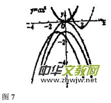 二次函數(shù)復(fù)習(xí)時(shí),教師可引導(dǎo)學(xué)生巧用數(shù)形結(jié)合如圖7,由特殊的形式y=ax2通過(guò)“平移”、“旋轉(zhuǎn)”,從而得出二次函數(shù)的種種類型,盡現(xiàn)二次函數(shù)中的豐富知識(shí),讓學(xué)生達(dá)到以數(shù)思形、以形釋數(shù)的高度概括的奇妙效果。