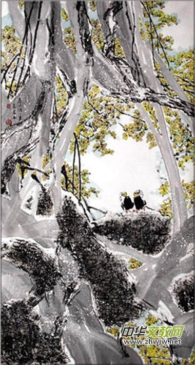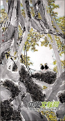 《春天悄悄來》這幅作品180×97cm,非常大氣,老樹枯枝在明媚的春光照耀下,發(fā)出嫩綠的枝芽,還開出菊黃色的花朵,真可謂老樹開花。一對小鳥在蒼老遒勁的樹根旁神情愉悅,舔著羽毛,生動和諧,別有一番風(fēng)趣。作者筆下透露出春的景致,清新自然,曲折有致,韻味淡雅。看似不甚著力,然而韻味卻雋永醇厚,含蓄優(yōu)美,深厚綿長,不染人間雜塵;表現(xiàn)出一種淡靜之美,讓人頓悟禪的境界,產(chǎn)生超越物外的向往。