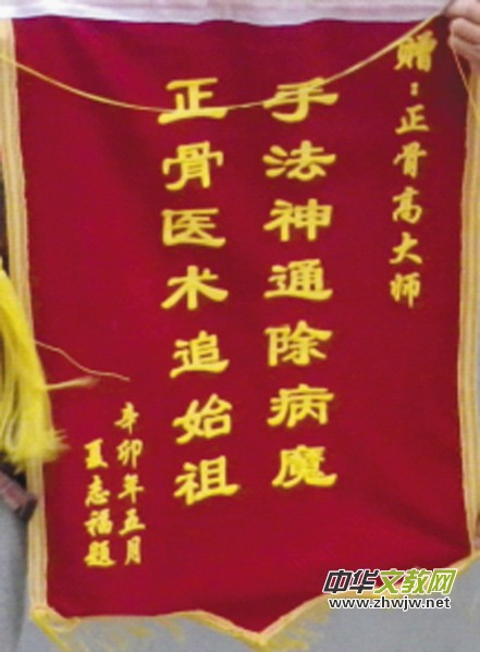 最近,康復(fù)患者夏志福送給高傳香的錦旗如是說:“手法神通除病魔,正骨醫(yī)術(shù)追始祖——贈正骨高大師”,感激之情溢于言表。
