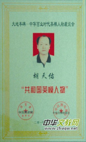 胡天佑,男,1945年生。高級(jí)工程師,國家級(jí)科技成果研制功臣,高級(jí)民間傳統(tǒng)療師(即中醫(yī)中藥)。應(yīng)用中醫(yī)中藥補(bǔ)腎壯陽從根本上醫(yī)治性功能障礙,對糖尿病、骨折及骨關(guān)節(jié)疾病(腰椎間盤脫出、腰痛、腰肌勞損、風(fēng)濕、類風(fēng)濕)、感冒、發(fā)燒、胃特靈藥酒、痔瘡、胃出血或痔瘡噴射性大出血止血、腎絞痛、消胸水或腹水、升或降血壓、神經(jīng)性疼痛等特效組方,有些病癥一劑藥治愈,可說是藥到病除,妙手回春,有些病癥則需多服幾劑,總有效率達(dá)98% 。他的醫(yī)技特長榮獲全國首屆新世紀(jì)“華佗·醫(yī)圣林”金獎(jiǎng)。