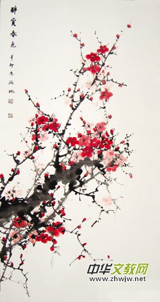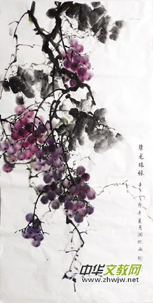 讓我們從她多姿多彩、生機(jī)勃勃的作品中欣賞藝術(shù)美吧!《富貴牡丹》畫面構(gòu)圖精心巧置,工寫結(jié)合,盛開的花朵色彩繽紛,濃淡相宜,疏密有致,變化多端,花朵各具形態(tài)。有的舒展怒放,有的含苞欲開,花瓣花蕊層次分明;花葉有俯有仰,豐富自然,枝干與嬌嫩的鮮花形成了鮮明的對(duì)比,將國(guó)色天香,花中之王的牡丹,表現(xiàn)的雍容華貴,美艷絕倫。給人以富貴、吉祥、幸福、繁榮的象征。從《梅》、《蘭》、《竹》、《菊》四君子中來看,更是將傲骨之梅,心素之蘭,節(jié)堅(jiān)之竹,清淡之菊,表現(xiàn)得風(fēng)骨錚錚,淋漓盡致。不僅具有神韻,而且把文人之靈趣、學(xué)養(yǎng)、品端高尚、情操磊落的特征全凝聚于筆端,隨意書寫,以示她一身正氣,堅(jiān)強(qiáng)無畏的精神品質(zhì)。《紫藤圖》筆力沉雄、蒼勁,枝條穿插疏密有致,藤條柔韌有力,紫藤花絮風(fēng)情萬種,隨風(fēng)飄蕩,頗有野逸之趣,顯現(xiàn)出高超的組織能力。這種寫意花卉既有一定真實(shí)感,又表現(xiàn)出相當(dāng)筆墨技巧,真乃暗香襲人矣。觀《葡萄》畫作,清新可人,一串串晶瑩剔透的葡萄,好像一顆顆或大或小的寶石,相互間交錯(cuò),似乎在相互訴說著豐收的喜悅和成功的快意。畫中多如繁星的葡萄以傳統(tǒng)的寫意繪成,通過深淺不一的紫紅色、紫藍(lán)色及灰黑色表達(dá)出陽(yáng)光與葡萄、葡萄與葡萄間的光影透視關(guān)系,并以精巧的留白,透出葡萄水潤(rùn)的光澤,讓觀者仿佛已經(jīng)觸到葡萄皮內(nèi)包裹著的嫩嫩的果肉,嗅到酸酸甜甜的果香。