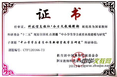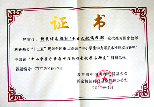 經教育部中國教師發展基金會、國家教師科研專項基金管理辦公室批準,《科技信息報·今日文教》編輯部被指定為國家教師科研“十二五”規劃重點課題《中小學生學力素質水準建模與研究》總課題和子課題《中小學學力素質水準新課堂教學與研究》的組織研究者和課題科研單位,并被總課題組授權為其總課題組學術研究平臺,本報主編靳新國和編輯部主任王紅研為總課題專家組成員、主編靳新國并被任命為工作組組長。經決定,二零一二年主要工作以發展國家教師科研專項基金十二五”規劃重點課題《中小學生學力素質水準建模與研究》子課題、實驗區校,和編輯部承擔的子課題《中小學學力素質水準新課堂教學與研究》實驗聯合校、研究員為首要工作,同時開展“全國優秀校長、班主任、教師”的推薦評選、和“全國優秀教師論文”、“全國教師教育科研錄像優質課、課件、教案評選”活動等。具體申報《中小學學力素質水準新課堂教學與研究》實驗聯合校、或研究員條件及要求、服務如下: