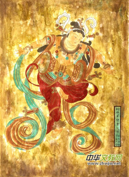 6.飛天宮女和樂舞伎。飛天是佛教八部眾天神之一。據(jù)佛經(jīng)上講,她們居住在風(fēng)光明媚的寶山中,專采百花香露,散天雨花,放百花香。每當(dāng)樂鼓齊鳴,天花紛飛的佛說法的莊嚴(yán)時(shí)刻,她們就出現(xiàn)在天空。飛天作為一種藝術(shù)形象出現(xiàn)在我國古代繪畫中,應(yīng)當(dāng)說是一種杰出的創(chuàng)造,她們的飛,不是靠身上長著的翅膀,而是僅靠她們身上幾條臨風(fēng)飛舞的彩帶,不論是平馳,斜趨、仰升還是俯降,都如同游魚戲水,飛鳥當(dāng)空,顯得那樣自在,輕盈而又美妙。敦煌壁畫是飛天最集中的地方。在莫高窟492洞窟中有三百七十多個(gè)洞窟繪有飛天,共計(jì)四千五百余身。這些飛天大都畫在洞窟中較高的壁面,她們配合整窟壁畫起著裝飾的作用,同時(shí)也豐富了“天衣飛揚(yáng),滿壁風(fēng)動(dòng)”的意境。敦煌第321窟和第320窟上的飛天就是整個(gè)敦煌壁畫中飛天形象最完美的代表。飛天在國外已經(jīng)成為敦煌壁畫的代名詞。