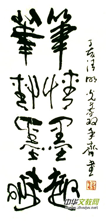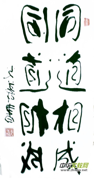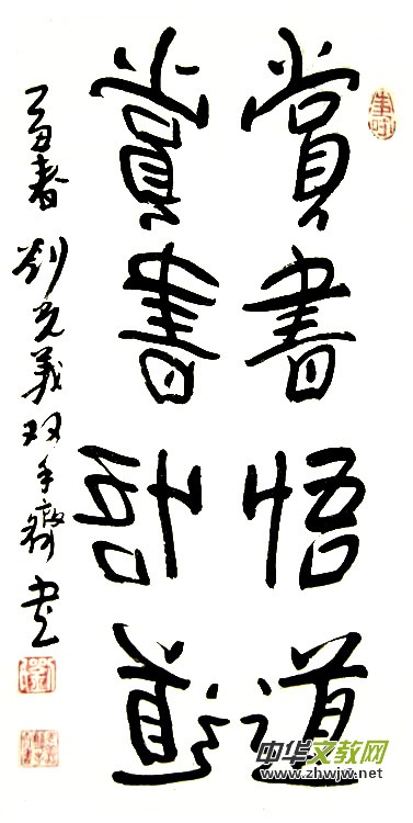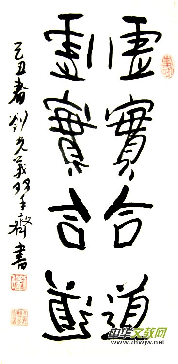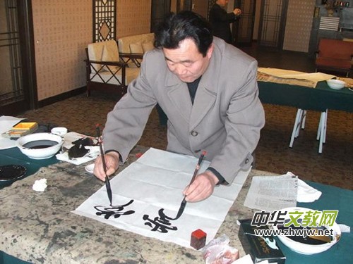 2001年,幾乎是一個(gè)神來之念,在別人看來是“異想天開”的念頭:書法既然是藝術(shù),為什么只能用單手不能用雙手來書寫?如果用雙手書寫,右手寫正字,左手寫反字,一正一反,成雙成對(duì),不是更能體現(xiàn)書法藝術(shù)的美感嗎?坐而思不如起而行,他便潛心揣摩和練習(xí)起來,功力不負(fù)有心人,他終于成功了。2006年,全國政協(xié)主辦的大型刊物《畫界》第五期對(duì)劉光義的雙手書法做了專題報(bào)道,并稱他為“中國著名雙手書法藝術(shù)家”。