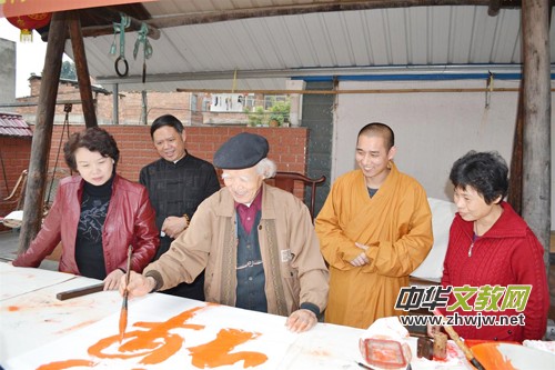 2013年2月28日上午,記者一行來到長泰縣龍津路二號(hào),在熱心主人陳坤生先生的引導(dǎo)下,來到了“任漢平美術(shù)館”籌備處,只見一鶴發(fā)童顏、精神矍爍的耄耋老人端立于庭院邊一張巨大的畫案前,手執(zhí)大筆,氣定神閑,眼隨手走,筆隨心到,數(shù)秒間一幅四尺大字展現(xiàn)眼前。